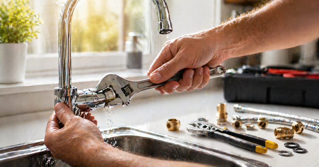Hands using wrench to fix a leaking tap at home with tools on kitchen counter